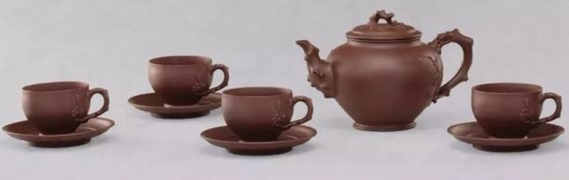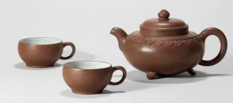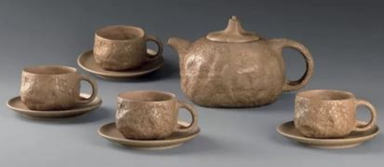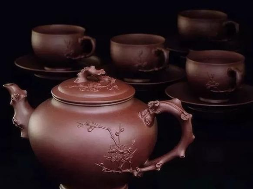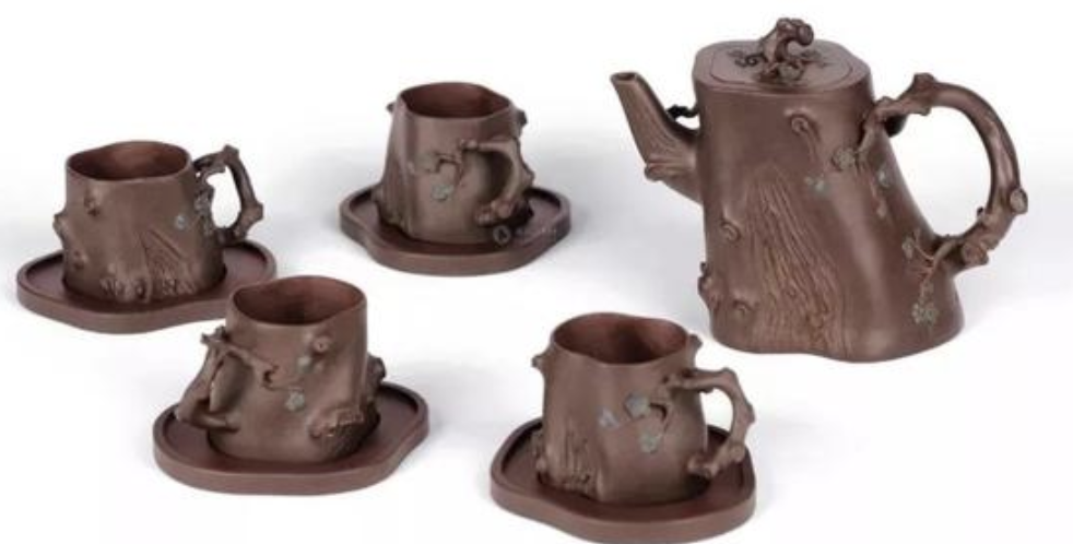 這一套茶具創(chuàng)造的閉頭是供春壺的身筒和杯子的身筒,由于供春壺壺身是“樹癭”,也即是大樹虬枝上的樹瘤,有凹有凸。樹癭紋路要亂而沒有散,完全效驗又央求骨血勻和、精力豐滿,藝術(shù)作風協(xié)調(diào)一致。